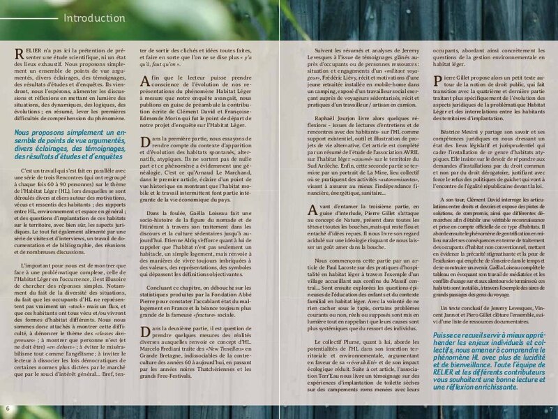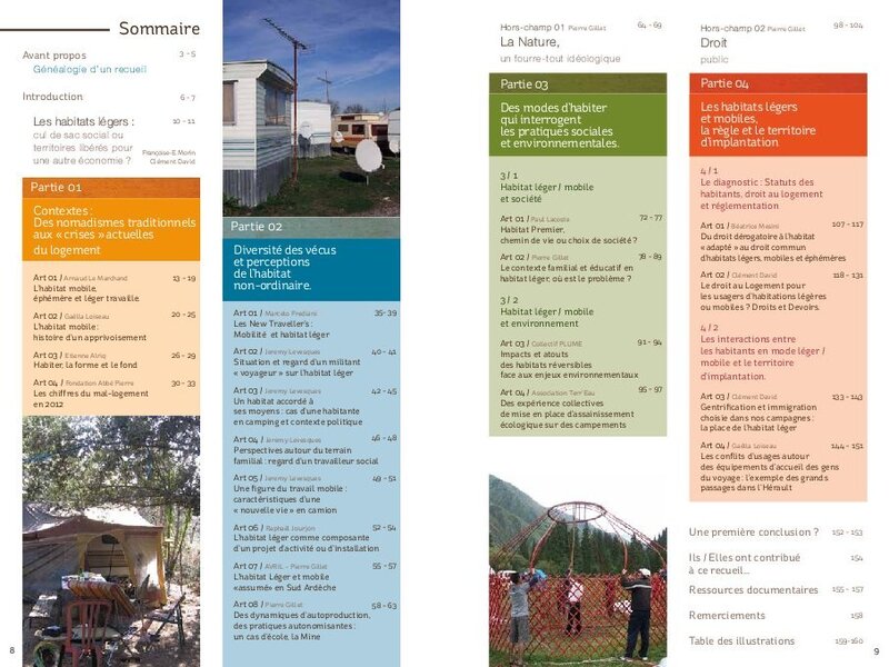 Ce recueil offre donc un tour d’horizon parfois subjectif de l’habitat léger, en privilégiant les retours d’expériences et les réflexions d’auteurs divers : chercheurs, acteurs de terrain, habitants de logements légers/mobiles, militants...